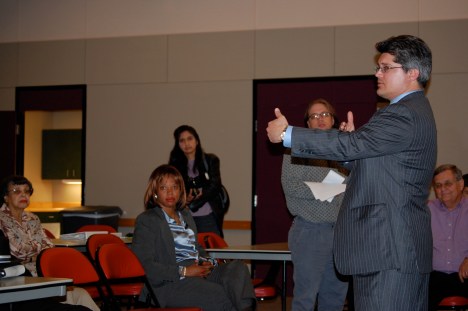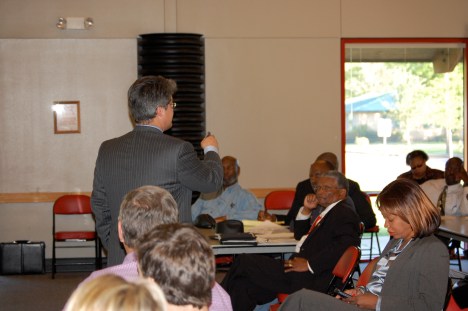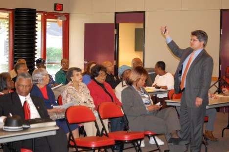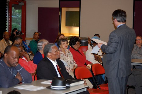 Caption: Mayor Roy addresses the Lower Third Neighborhood Association at the Broadway Resource Center.