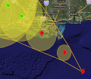 It looks like Gustav will make landfall in between Houma and Lafayette. It should start raining here around noon, but we won’t be experiencing the hurricane (which, by then, should be a Cat 2) until after the sun has set.