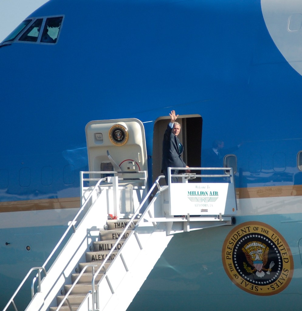 Obviously, it’s not every day that Alexandria plays host to a sitting United States President, and we’re not accustomed to Air Force One or Presidential motorcades. But suffice it to say, hundreds of people showed up to view the spectacle and catch a glimpse of Mr. Bush.