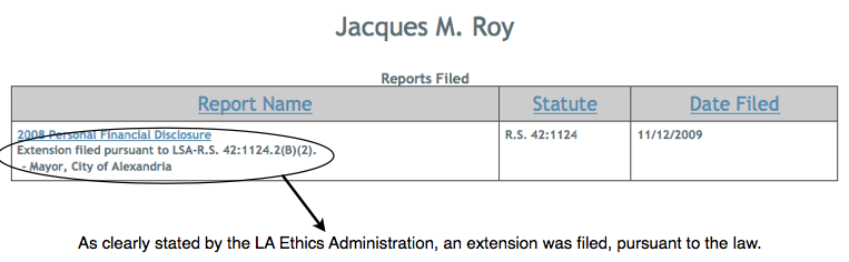 Because on April 27, 2009, Jacques Roy DID file an extension, which, again, is clearly noted on the Ethics Administration website.