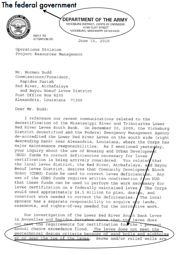 “Despite Alexandria Mayor Jacques Roy’s Levee Alliance telling the Louisiana Recovery Authority (LRA) that the damages to our levees were caused by sand-boils on our levees, which could be said to have been caused by the hurricanes supposedly, Jacques fails to mention that the federal government has written and said that our levee problems are caused by cuts in the Bayou Rapides levee by private businesses for their own private parking lots, electrical utilities place upon the levee by the City of Alexandria, and the water and sewer lines ran in the Red River levee by the City of Pineville.”