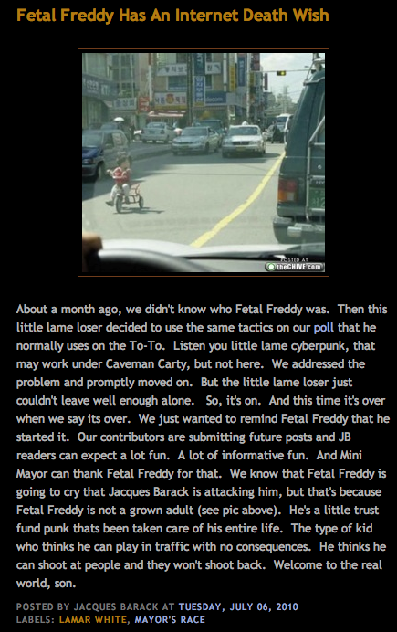 I take this very seriously. I don’t deserve to be ridiculed for being disabled, and I believe that JacquesBarack’s “anonymous” blog was created to support and supplement a political campaign.