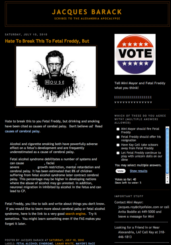 On a nearly daily basis, pro-Von Jennings’s blogger JacquesBarack has publicly assailed and ridiculed me for being disabled with cerebral palsy.