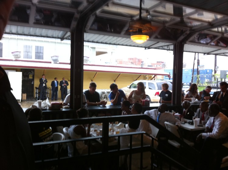 The President and his wife were both very gracious, and Parkway Bakery and Tavern was a great choice for lunch. For over 100 years, it’s been a New Orleans institution, and in the aftermath of Hurricane Katrina, the building was severely damaged. I didn’t notice it today, but the last time I was there, the watermark from the flooding was clearly visible. Most importantly, the place serves a righteous po’boy.
