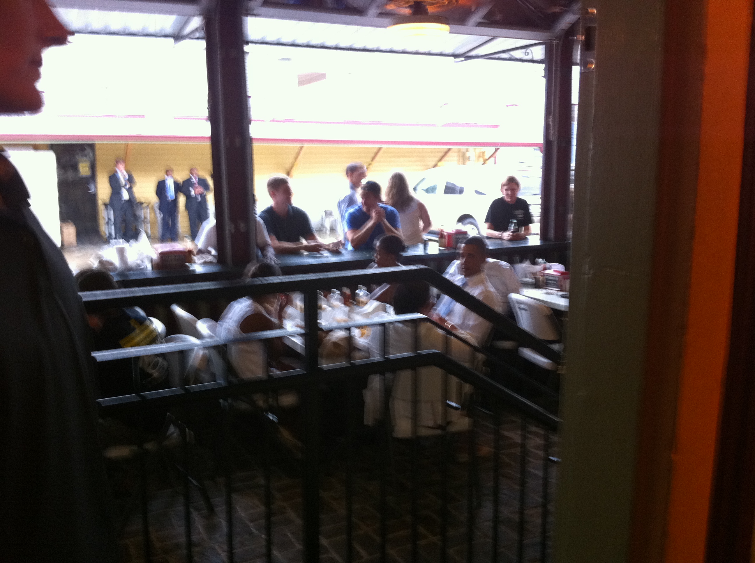 Early this afternoon, as we were packing to head back to Alexandria, a young man walked by the house and, seeing us on the front porch, announced, “The President’s down the street. He’s eating lunch at Parkway.” I was staying at my friend’s house on Lafitte, about a block and a half away from the historic bakery and tavern. So we hurried out of the house and walked over to the Parkway, where a swarm of Secret Service agents had assembled. The President’s motorcade was parked directly in front of the restaurant.