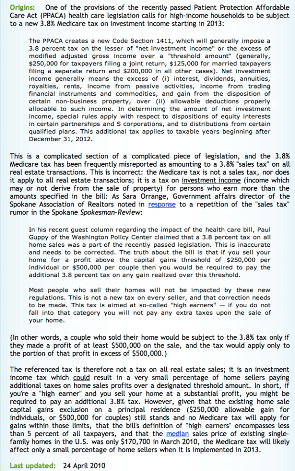 Snopes.com has never “verified” Mr. Coco’s claim that the health care bill “rammed through” a “3.8% sales tax on home sales in 2013.” The claim is both misleading and false.