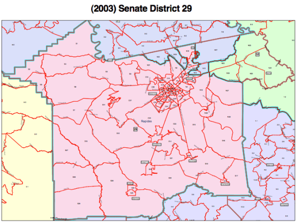 I’ve highlighted the new boundaries of Louisiana State Senate District 29, which, as of today, is (essentially) coterminous with Rapides Parish. Here’s what the district looks like currently (zooming in on Rapides Parish, in pink):
