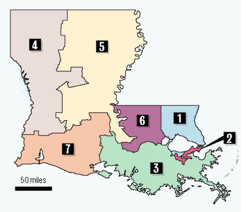 I am amazed at the ways in which Governor Jindal and the Louisiana media have been able to successfully parrot this line about “two north Louisiana-based districts.” We do not currently have “two north Louisiana-based districts,” and the legislature has never entertained any such plan. This is what our Congressional districts look like currently, and this is, essentially, the model Jindal supports: