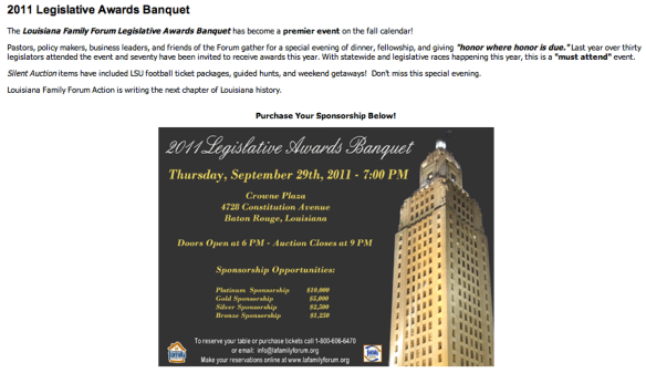 For the bargain basement price of $10,000, you can become a platinum sponsor of this year’s Louisiana Family Forum Awards Banquet. Unfortunately, it’s not clear whether or not this donation would be tax-deductible, as it has been in years past. This year, the LFF is saying that the “Louisiana Family Forum Action,” their 501c4 (not tax-deductible), “is writing the next chapter of Louisiana history.”