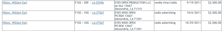 That’s $7500 in less than six weeks, all paid to Eyes Wide Open, Tony Brown’s company. Either Tony has the most expensive radio spots (per capita) in Louisiana or he’s being compensated for something other than merely running a 30-second commercial on his local morning radio show. There is a third option, of course: Tony Brown may just ripping off the Hilton campaign. (If only Hilton were always running for election, Tony could be making more than $100,000 a year, from only one account). Given Tony’s recent remarks, it definitely appears as if he considers himself to be more of a paid spokesman than an objective businessman. Earlier this week, Tony repeatedly embarrassed himself by resorting to profanity and incredulity after Greg Aymond wrote about his involvement with the Hilton ad. Greg, a former member of the Ku Klux Klan, for some reason, considered himself to be Tony’s friend, which was backed up by Tony’s phone call to Greg Aymond’s home. Once again, politics makes for strange bedfellows. Incidentally, until now, no one has written about what, exactly, Tony Brown has been paid for his services. Ooops.