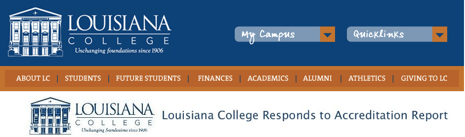 Earlier this month, the Southern Association of Colleges and Schools (SACS) placed Louisiana College on warning and denied reaffirmation of its accreditation. And perhaps not surprisingly, Louisiana College’s leadership, in full-damage control mode, has consistently sought to downplay the seriousness of the warning, even while unwittingly acknowledging its importance. Currently, this is what appears on LC’s homepage: