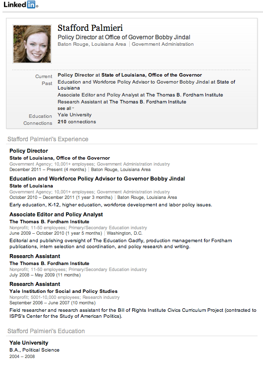 A few months ago, Ms. Palmieri was promoted to Policy Director for Governor Bobby Jindal, a commendable accomplishment for a young woman who is still in her mid-twenties. But there’s an interesting footnote here, and it needs to be pointed out.