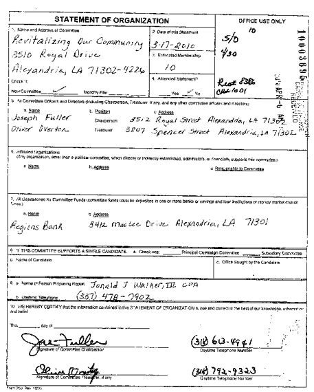 The political action committee Revitalizing Our Community (or ROC) was established on March 17, 2010 by former Rapides Parish Police Juror Joe Fuller and current Rapides Parish Police Juror Oliver Overton.