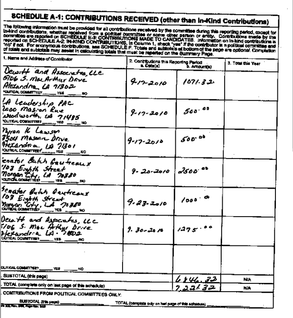 Dewitt has given thousands and thousands of dollars to help prop up ROC, both through his mothballed campaign fund and through his businesses. Dewitt’s first contributions were received in September of 2010. You’ll also notice contributions from Myron Lawson and Butch Gautreaux; both of them were reimbursed completely for their donations.
