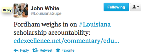 Less than 24 hours after Superintendent White announced his “academic accountability” plan for voucher schools, it was embraced by a blogger at the Fordham Institute, a fact that Mr. White was happy to report: