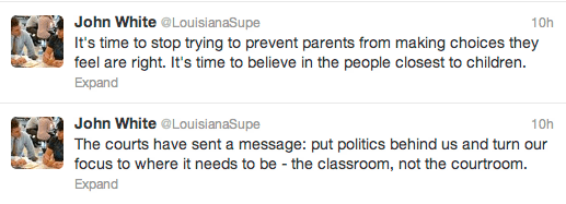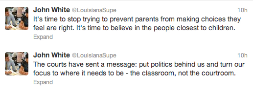 Either way, in a few months from now, when these issues of fact are finally in front of the courts, remember that the only reason the Louisiana Supreme Court refused to order an injunction is because John White said it would have caused a deficit in his department. And when the facts finally are revealed, remember that John White once praised the court for validating his “message.” Remember, that for the last couple of months, it’s been easier and much more convenient for Superintendent White to duck behind the political rhetoric of “parental choice” than face the reality of his own massive administrative and oversight failures.