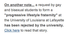 This story is actually just a recapitulation of a tall tale told to another website, South Florida Gay News, describing the poor plight of an aspiring “ULL Law School student” (note: ULL does not have a law school) who, after spending time as a hardcore gay porn actor, had his dreams of opening his very own gay fraternity crushed by the ULL administration (who claim, on the record, that they have no idea what the hell this guy is talking about).