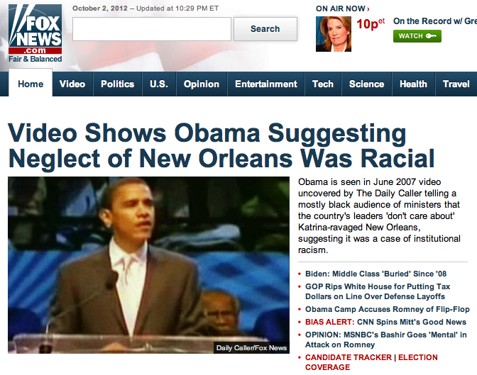 At least one Louisiana-based blogger agrees with Fox’s angle. In a post titled “The 2007 ‘Ghetto Obama’ Speech,” Scott McKay (who completely misses the legitimate criticisms of Stafford Act exemptions) of The Hayride writes: