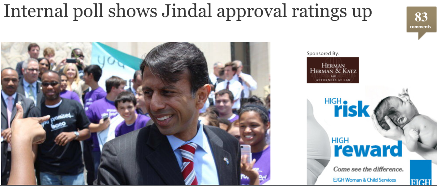 Jindal and company, however, would prefer that we focus on the results of his “internal” poll, which showed his approval at 50%. And not surprisingly, the media was happy to oblige. This is the headline that appeared in The Times-Picayune: