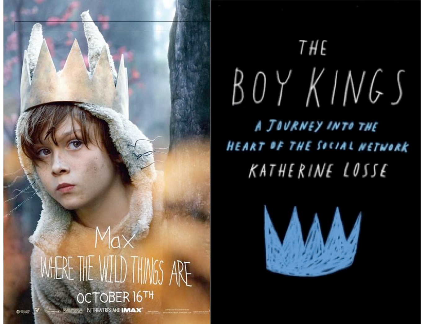 On the left, the cover of the movie Where the Wild Things Are, a movie adapted for the screen by none other than Dave Eggers. And on the right, three years later, the cover of Ms. Losse’s book. Who, exactly, is appropriating from whom? It is also worth pointing out: Ms. Losse’s subtitle, “A journey into the heart of the social network,” two years after The Social Network became an international smash hit.