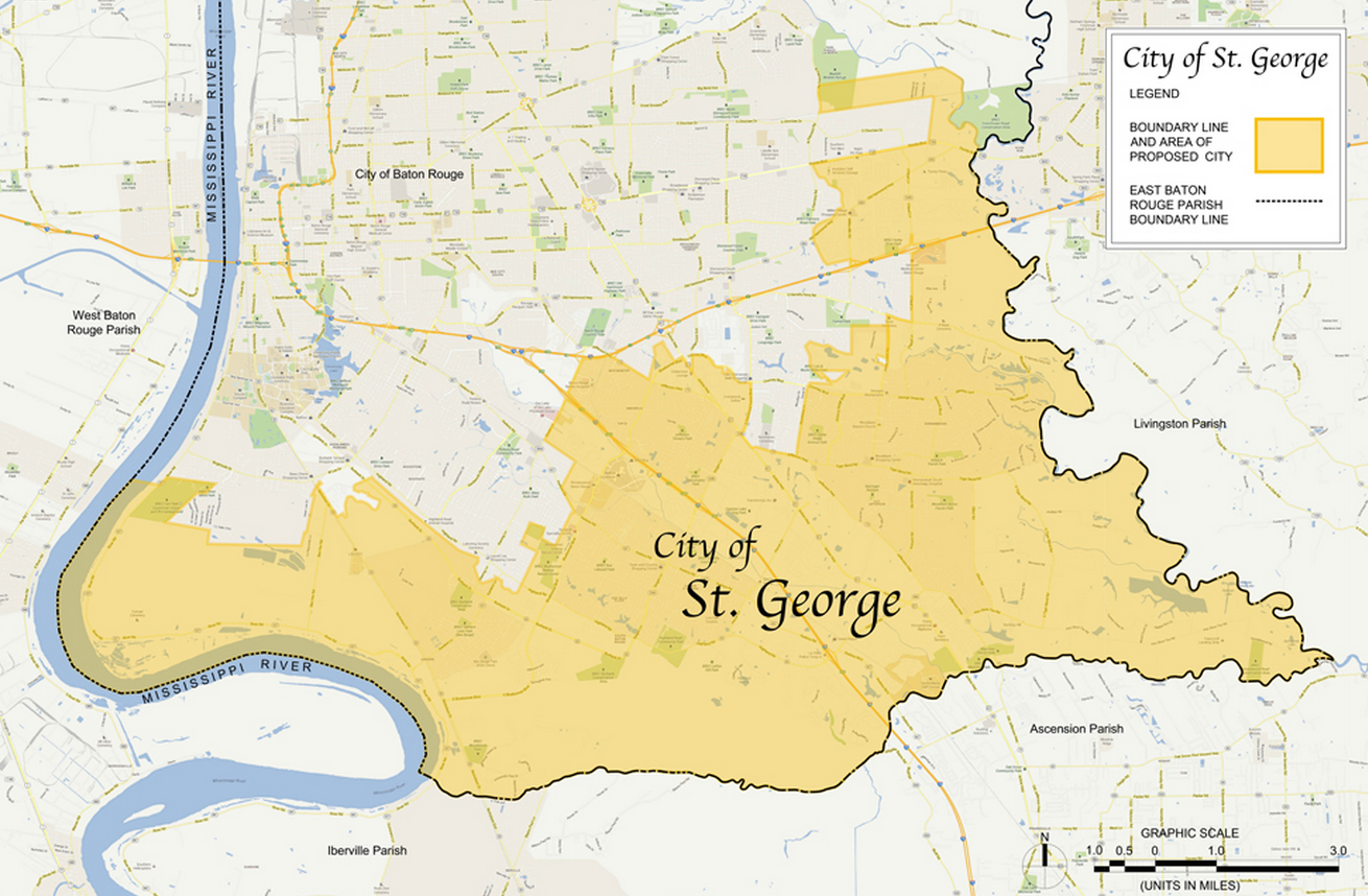 Salon was straight to the point: “White, affluent residents of south Baton Rouge want to secede from the rest of the city: The proposed new city would be called St. George and would remove 40 percent of Baton Rouge’s sales tax revenue.”