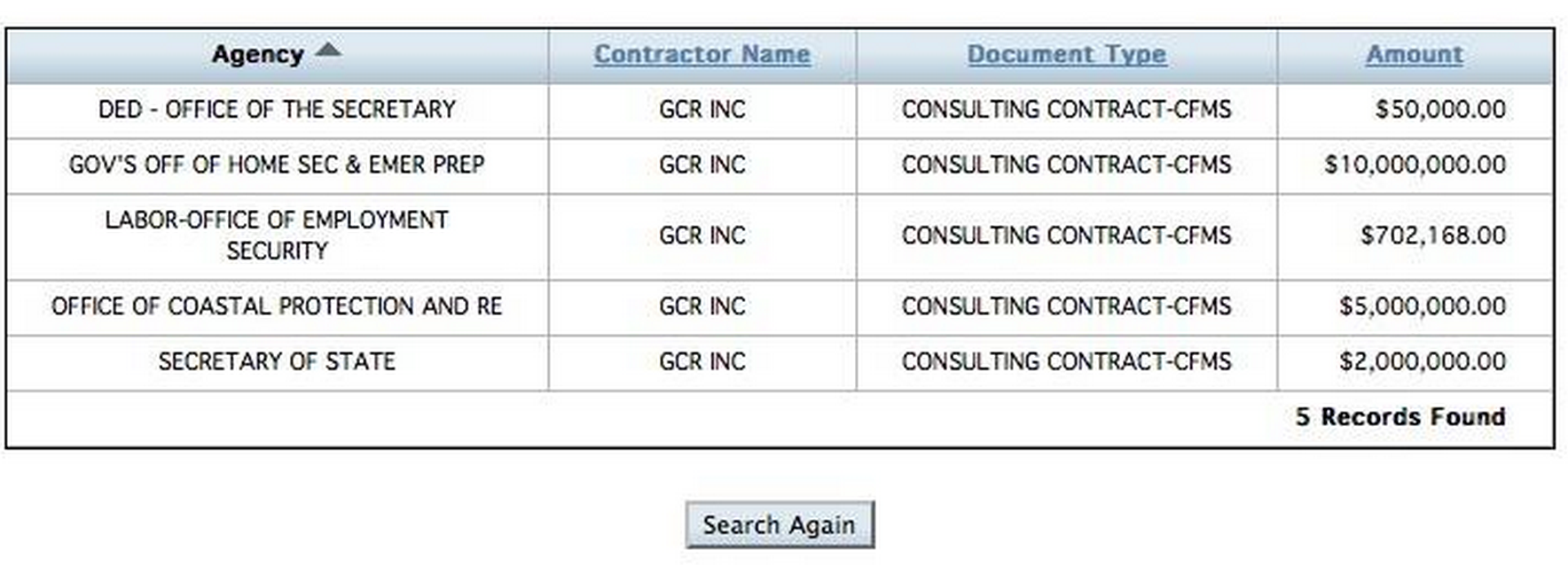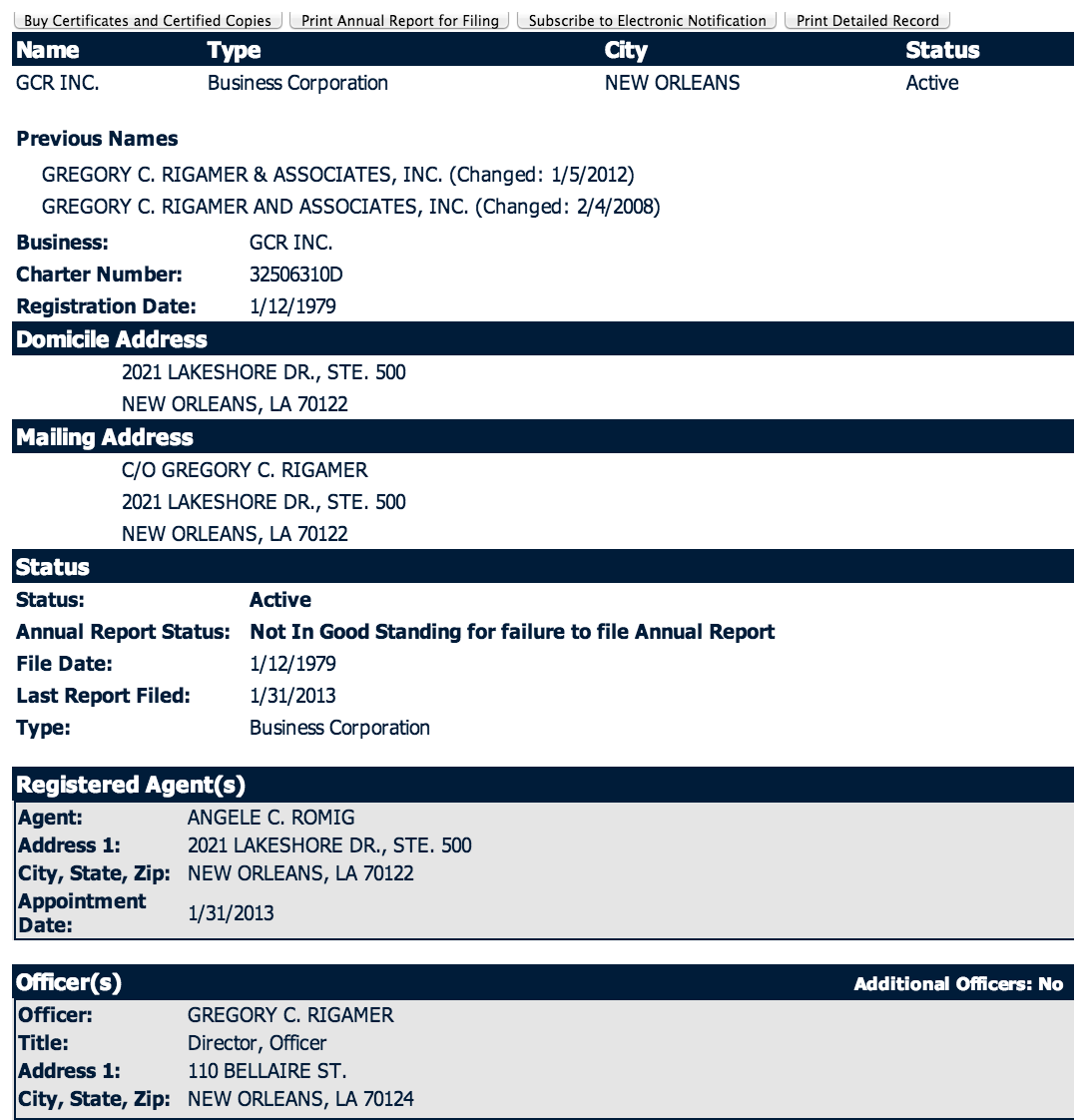 Ironically and embarrassingly, despite the fact that Rigamer’s company’s $2 million contract also includes the design of its “Commercial Online Registration Application,” the Louisiana Secretary of State lists GCR as “Not in good standing.”