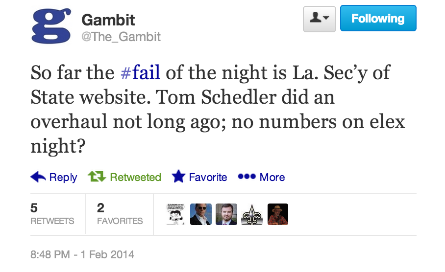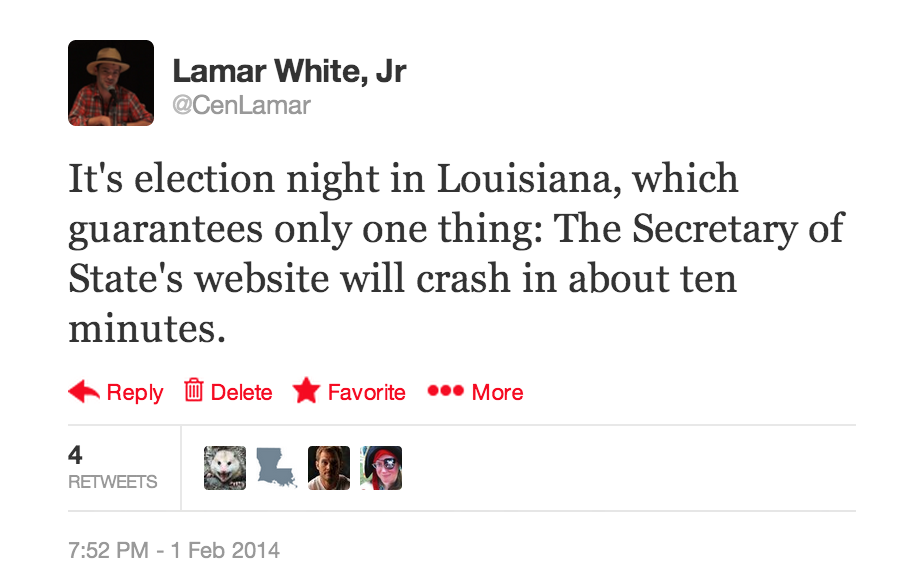 Of course, this is obviously not the most pressing problem facing Louisiana, but until tonight, I had been willing to simply assume that the chronic failures of the website on election nights were a result of technical glitches and run-of-the-mill institutional incompetence. Now, I am not so certain.