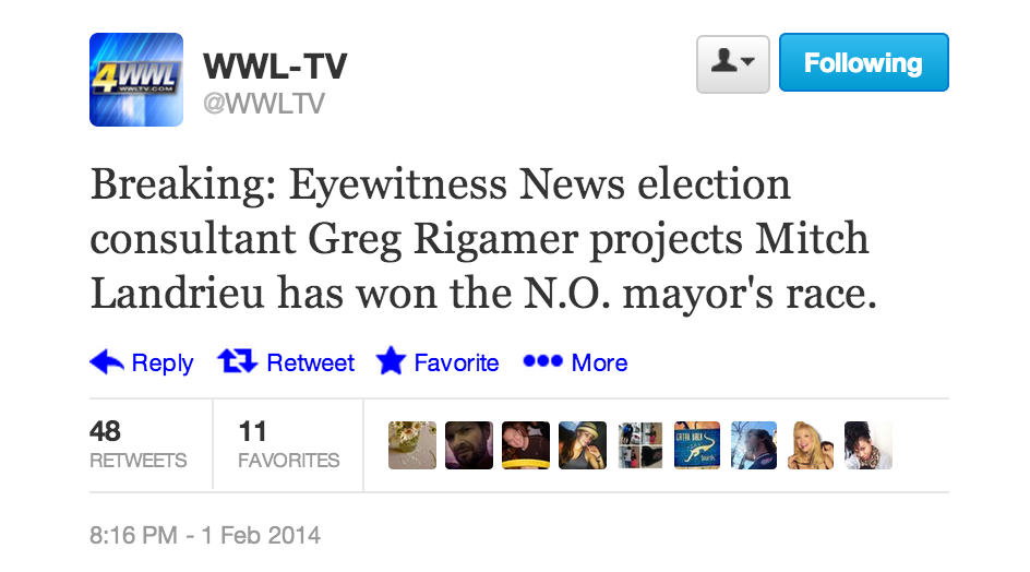 Make no mistake: When a reputable local news station decides to call an election only sixteen minutes after polls close and before a single vote has even been posted, people pay attention. The rest of the media kept hitting the refresh button on a broken website, attempting to find results that Greg Rigamer and WWL had been privy to almost instantaneously. (Update: I should make it clear that I am not accusing WWL of doing anything improper; in fact, they should be commended for doing real, on-the-field grunt work).