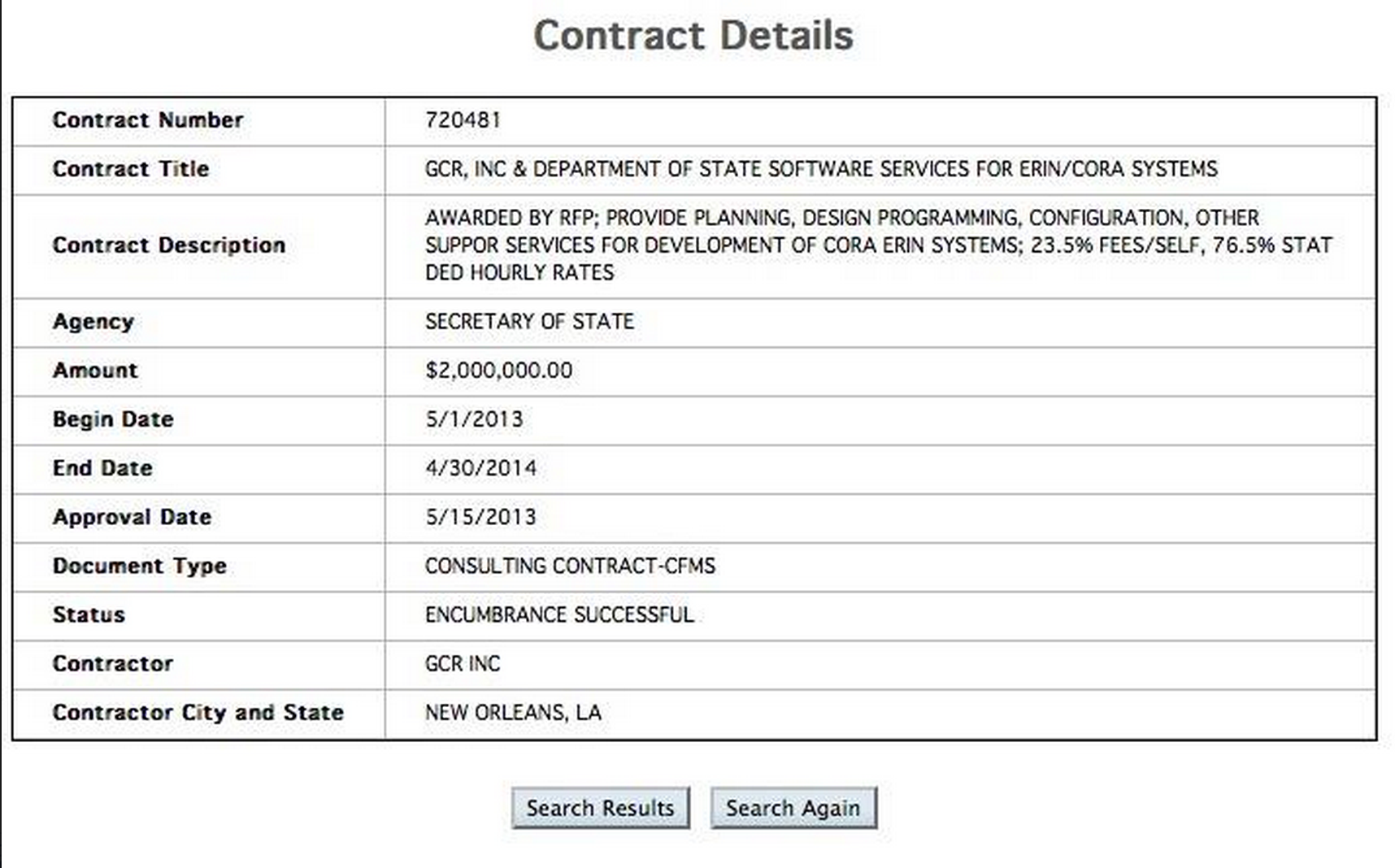 But that’s not the real problem here: The real problem is that Greg Rigamer’s company, GCR, recently signed a $2 million contract with the Louisiana Secretary of State to plan, design, configure, and support its “Commercial Online Registration Application” (CORA) and its “Elections Registration and Information Network” (ERIN).