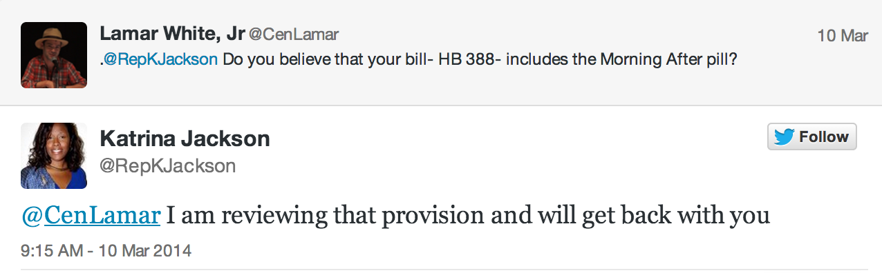I have since learned that Katrina Jackson did not actually write this legislation; it was written by a pro-life public interest law firm. And Representative Jackson does not believe that this bill would include Plan B. But when I first asked her on Monday, she wasn’t as sure. In fact, she told me that she’d have to get back to me; she didn’t know.