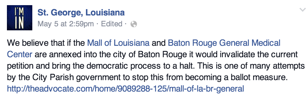 On Monday, the Mall of Louisiana and two of Baton Rouge’s biggest hospitals asked to be annexed into the City of Baton Rouge, a proposal that will certainly be embraced and quickly adopted by the Metro Council and Mayor-President Kip Holden. St. George organizers had counted on the projected tax revenues from these three major economic engines to subsidize and underwrite the creation of their new city government. Perhaps more importantly, the annexation of these three properties changes the description of the petition they’ve been circulating. They need 18,000 signatories to force a ballot initiative, and although they claim to be “four to six weeks away” from reaching that threshold, they also have publicly acknowledged, via Facebook, that the proposed annexations would legally invalidate their petition.