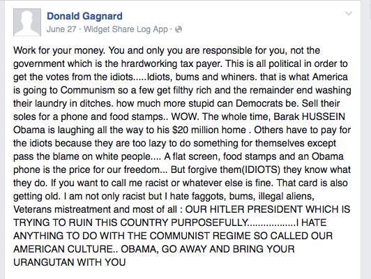 “I am not only a racist,” he writes, “but I hate faggots, bums, illegal aliens, Veterans (sic) mistreatment and most of all: OUR HITLER PRESIDENT…. OBAMA, GO AWAY AND BRING YOUR URANGUTAN (sic) WITH YOU.” As Patrick uncovered, Gagnard has been publicly sharing similarly hateful and vile commentary on his Facebook for months, all while running a campaign for the Lafayette Parish School Board.
