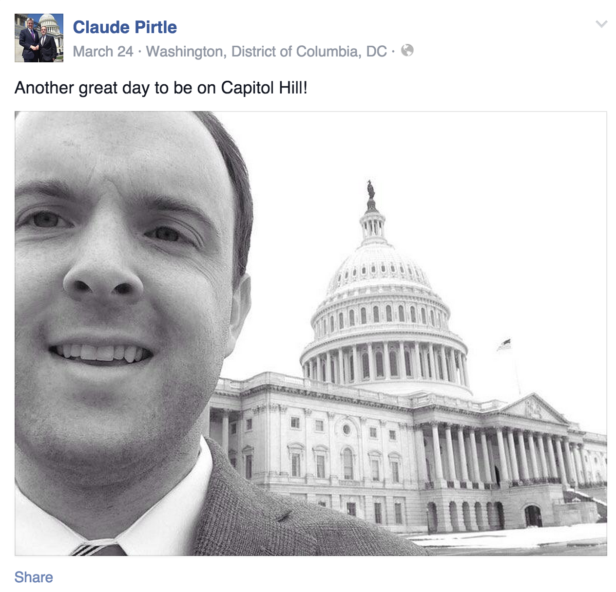 On March 24th, Pirtle posted this image of himself outside of the Capitol:
