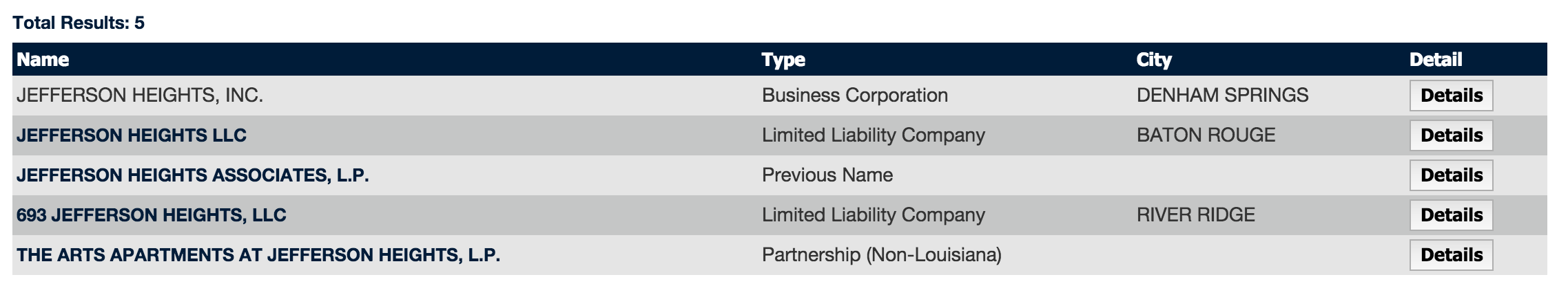 The Louisiana Secretary of State does, in fact, list businesses named “Jefferson Heights”:
