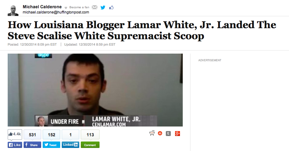 In late December, I broke the story of Congressman Steve Scalise attending a white supremacist meeting in 2002. In less than 24 hours, my story had crawled to the top pages of The New York Times, The Washington Post, and, among others, The Wall Street Journal, Huffington Post, Salon, Slate, The Daily Beast, and practically every other news publication in the country. I interviewed on MSBC and on the radio and with The Huffington Post and The Washington Post and The Daily Dot.