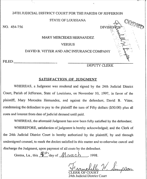 Vitter satisfied the judgment on March 4, 1998, and the bizarre story, which also involves accusations of a political conspiracy concocted by two prominent Louisiana Republicans, largely disappeared, though it was once referenced in a 2004 article in Salon.