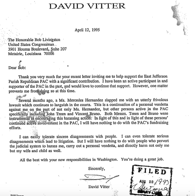 Vitter, for his part, believed that he was the victim of a political conspiracy. He countersued Hernandez, alleging, among other things, that she had caused him “mental anguish” by claiming he supported gay rights. He also wrote then-U.S. Rep. Bob Livingston, declining the Congressman’s invitation to support the East Jefferson Parish Republican PAC and informing him that the PAC’s leaders, specifically John Treen and Vincent Bruno, had colluded with Hernandez. “I can easily tolerate sincere disagreements with people,” Vitter wrote Livingston. “I can even tolerate serious disagreements which lead to litigation. But I will have nothing to do with people who pervert the judicial system to harass me, carry out a personal vendetta, and directly harm not only me but my wife and child as well.”