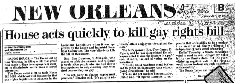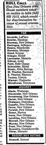 At the time, Vitter seemed particularly distraught by the notion that he had ever supported gay rights. Although he did, in fact, vote against tabling a bill that would have ended workforce discrimination on the basis of sexual orientation, he never explained his motivation or intention. Some have speculated that Vitter’s vote was either cast in error or was procedurally misguided.