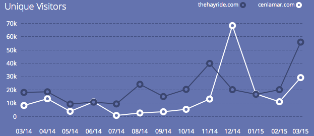 Screen Shot 2015-05-12 at 8.11.33 AMPerhaps not surprisingly, they reveal that The Hayride, which is continuously published on a daily basis, usually receives between 5.000 to 10,000 more unique visitors a month than I do. The exception, of course, was in January, shortly after I broke the story about Congressman Steve Scalise; that month, my website received 50,000 more visitors than The Hayride.