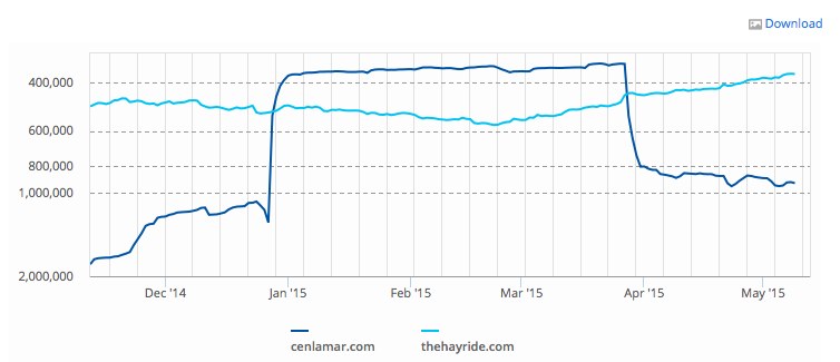 Consider these graphs. The first one compares my website’s monthly visitors with The Hayride’s, and the second compares our monthly rankings. Both of these graphs were pulled from the resources McKay references in his pitch to advertisers.