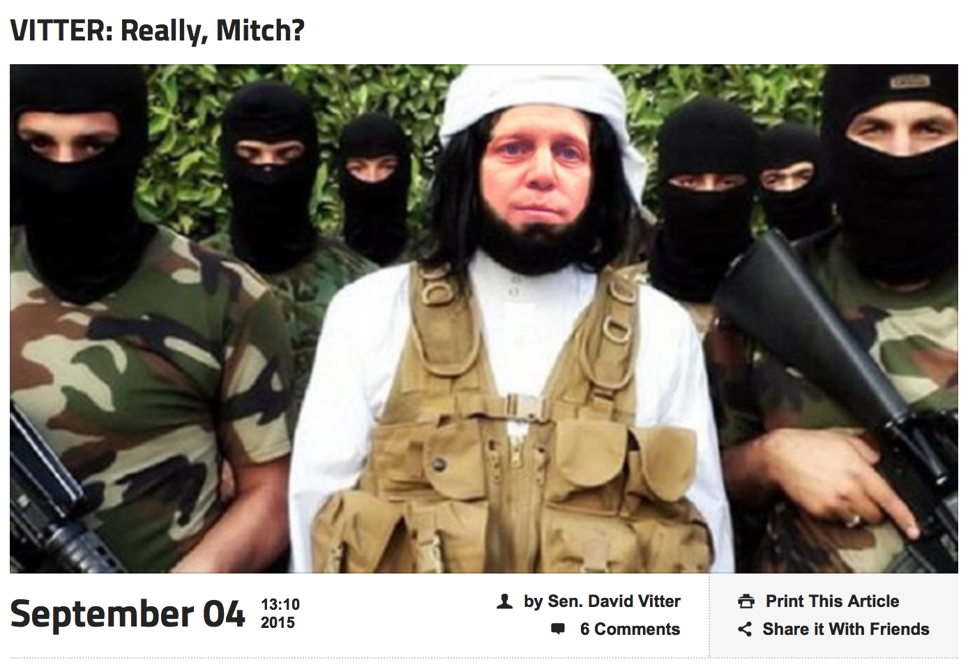 I imagine the privilege of having a guest column published by The Hayride must have thrilled Sen. Vitter. They didn’t spare any expense. They designed a header on Photoshop. They patched a few things together, and voila! The artwork for Sen. Vitter’s column would be Mitch Landrieu as the leader of a Muslim terrorist group (presumably for wanting to take down the Confederate monuments).