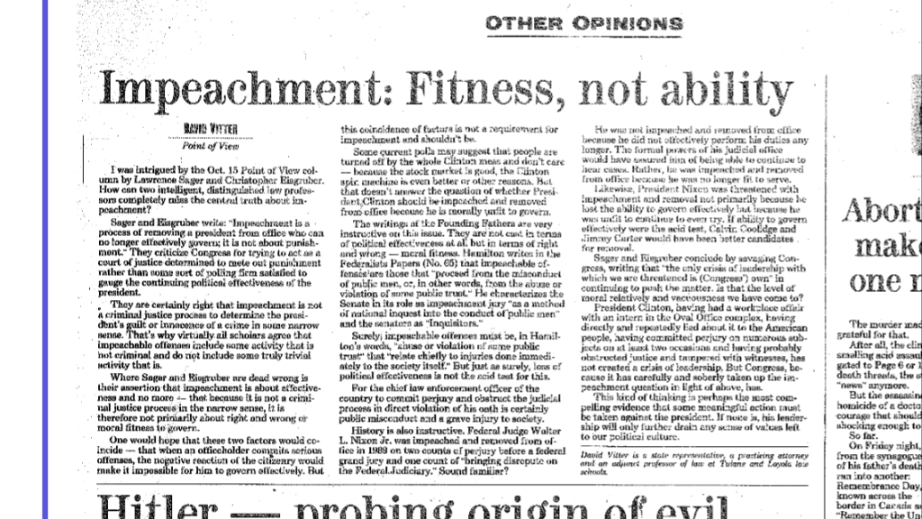 “One would hope… that when an officeholder commits serious offenses, the negative reaction of the citizenry would make it impossible for him to govern effectively,” a Tulane and Loyola Law adjunct professor wrote in the pages of The Times-Picayune in October of 1998. At the time, Congress was deciding whether or not to impeach President Bill Clinton, and the law professor argued that Clinton, however effective he may have been as an executive, was nonetheless unfit to govern. The problem, he contended, was about Clinton’s “moral fitness.”